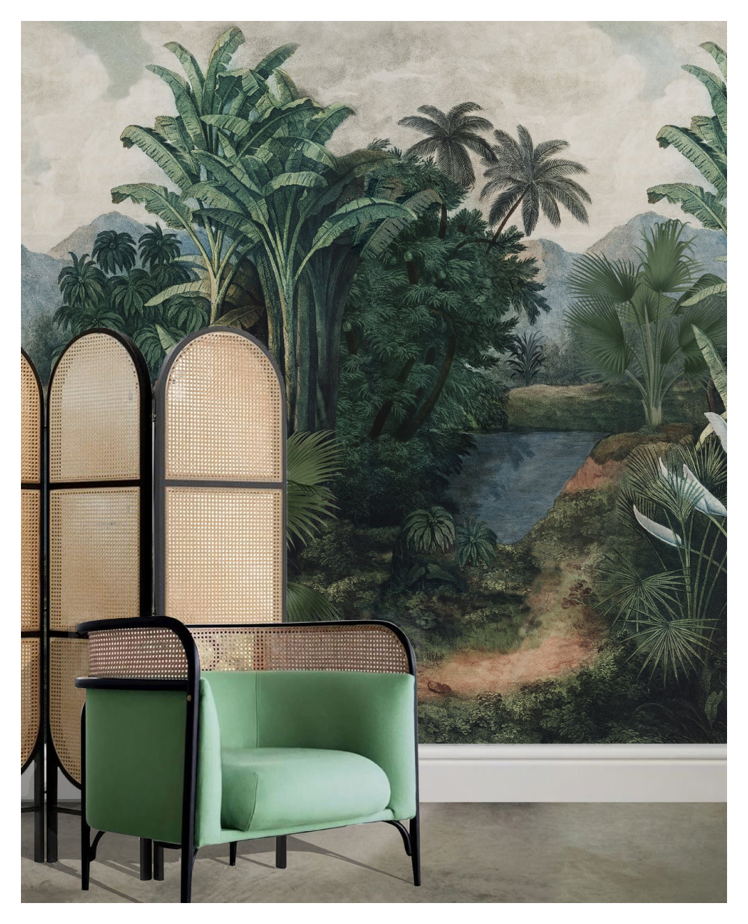 ransport your space to a hidden tropical paradise with the Palm Landscape Mural, a breathtaking depiction of Sydney’s evolving natural beauty. Inspired by designer Bethany Linz’s childhood memory of discovering a lush oasis along the Hawkesbury River, this mural captures the rich greens of towering palms, the soft blues of tranquil waters, and the warmth of Australia’s unique flora. Reflecting on the environmental shifts she’s witnessed, Bethany combines nostalgia with a celebration of Sydney’s growing tropical charm. Perfect for creating immersive interiors, Palm Landscape Mural transforms walls into a serene, painterly escape.